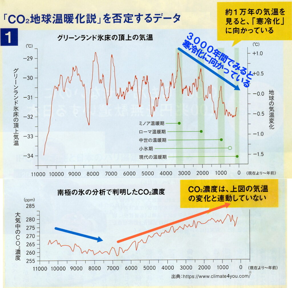 ただここで、1万年という長い期間で見るとどうなるでしょうか。ここで月刊ザ・リバティという雑誌で紹介されていた東京理科大学教授の渡辺正氏の論説を紹介します。渡部正氏は、ご著書「地球温暖化の不都合な真実」において、地球温暖化説の矛盾を科学的データに基づいて指摘しています。ここで一つのグラフを見てみましょう。