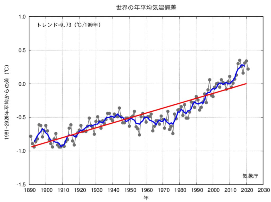 次のグラフは、気象庁における1890年から2020年までの世界の気温偏差となります。
