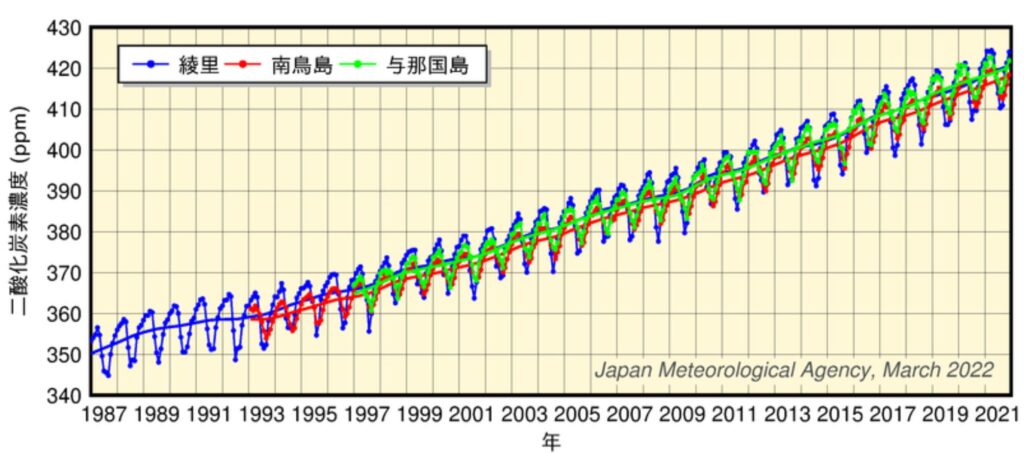 このデータからもわかるとおり、1987年から2021年にかけて、二酸化炭素の濃度が年々高くなっています。