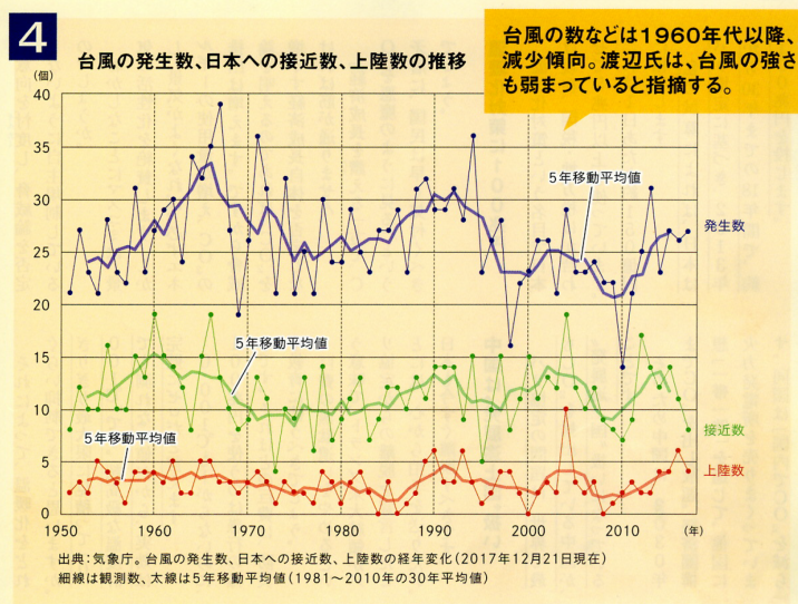 ここで気象庁の公式データを参照して、本当に台風の発生数が増加しているかを確認していきたいと思います。月刊ザ・リバティ(2020年2月号)に掲載されていた気象庁のデータになります。